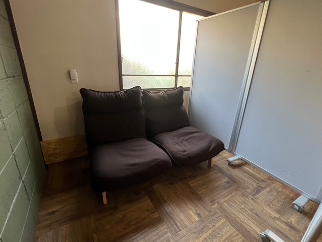 休憩する為のソファーがあり、 仕切りで分けています。 目や声の届くような空間となっております。